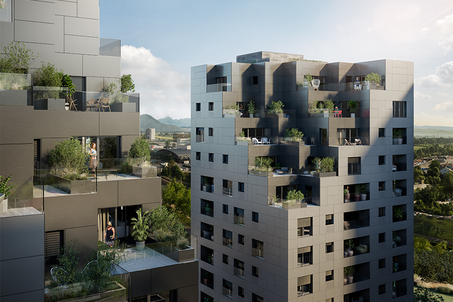 Gre za štiri 15 nadstropne stolpe, ki ponujajo eno-, dvo-, tri- in štirisobna stanovanja. V zgornjih terasastih nadstropjih se nahajajo nadstandardna stanovanja z razgledi v naravo, kjer so stolpnice stopničasto znižane in ustvarjajo vizualni dialog z alpskimi vrhovi na obzorju.