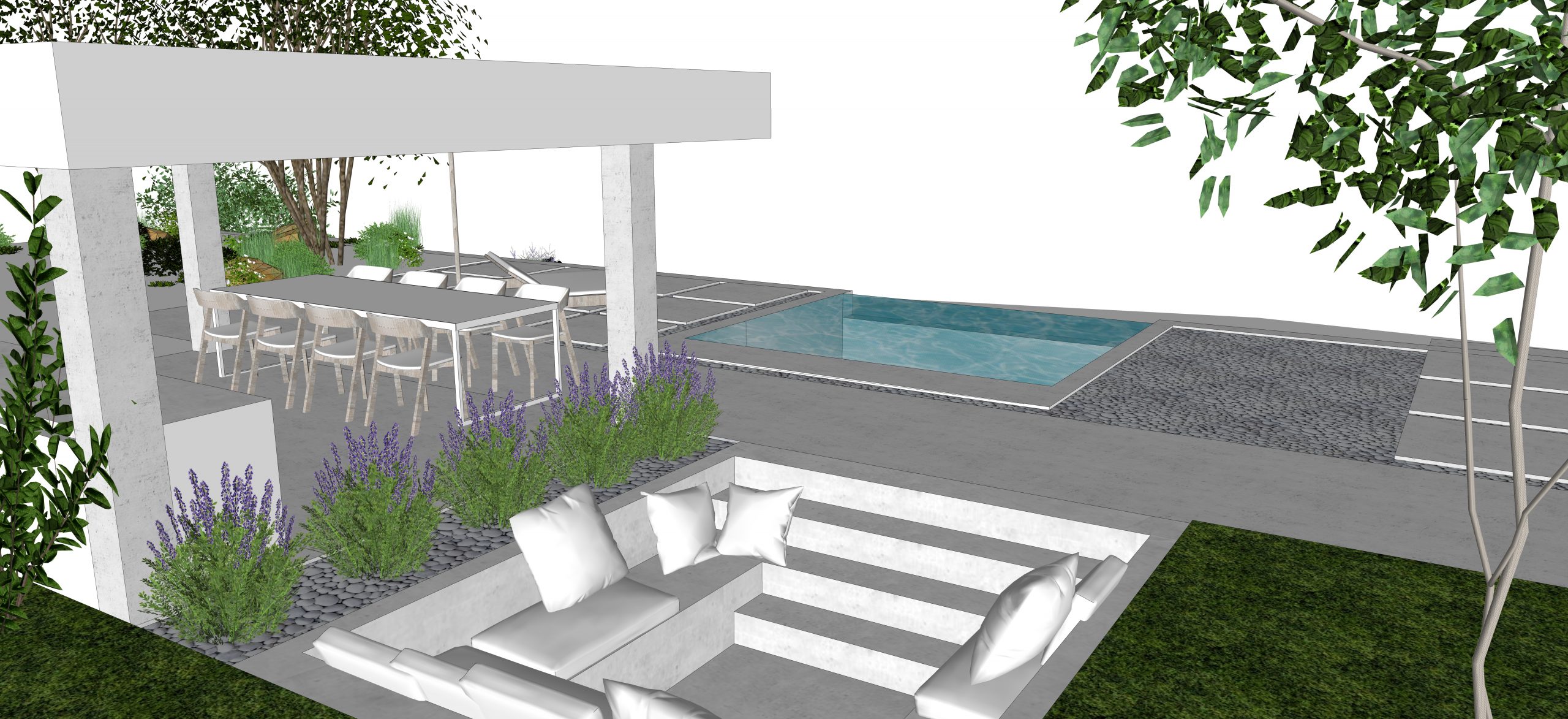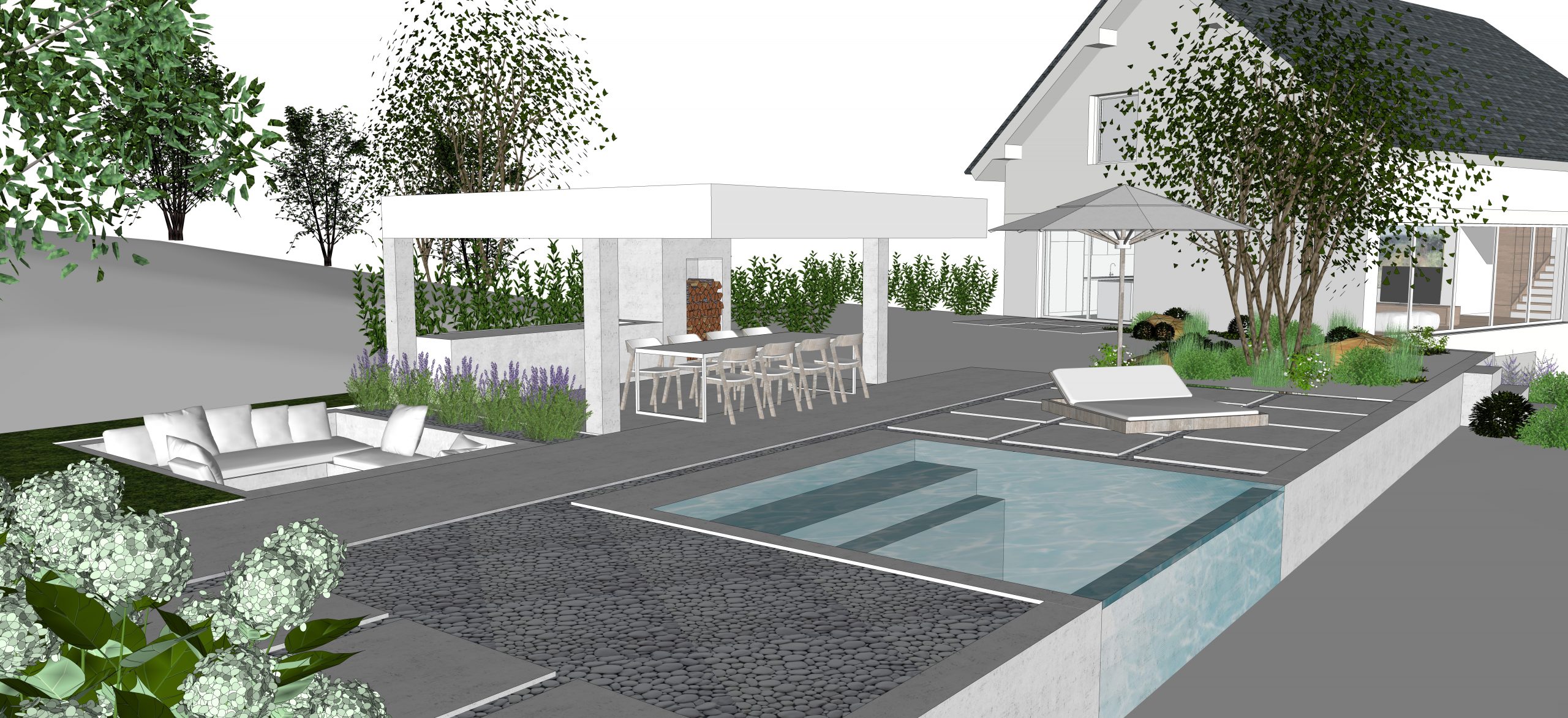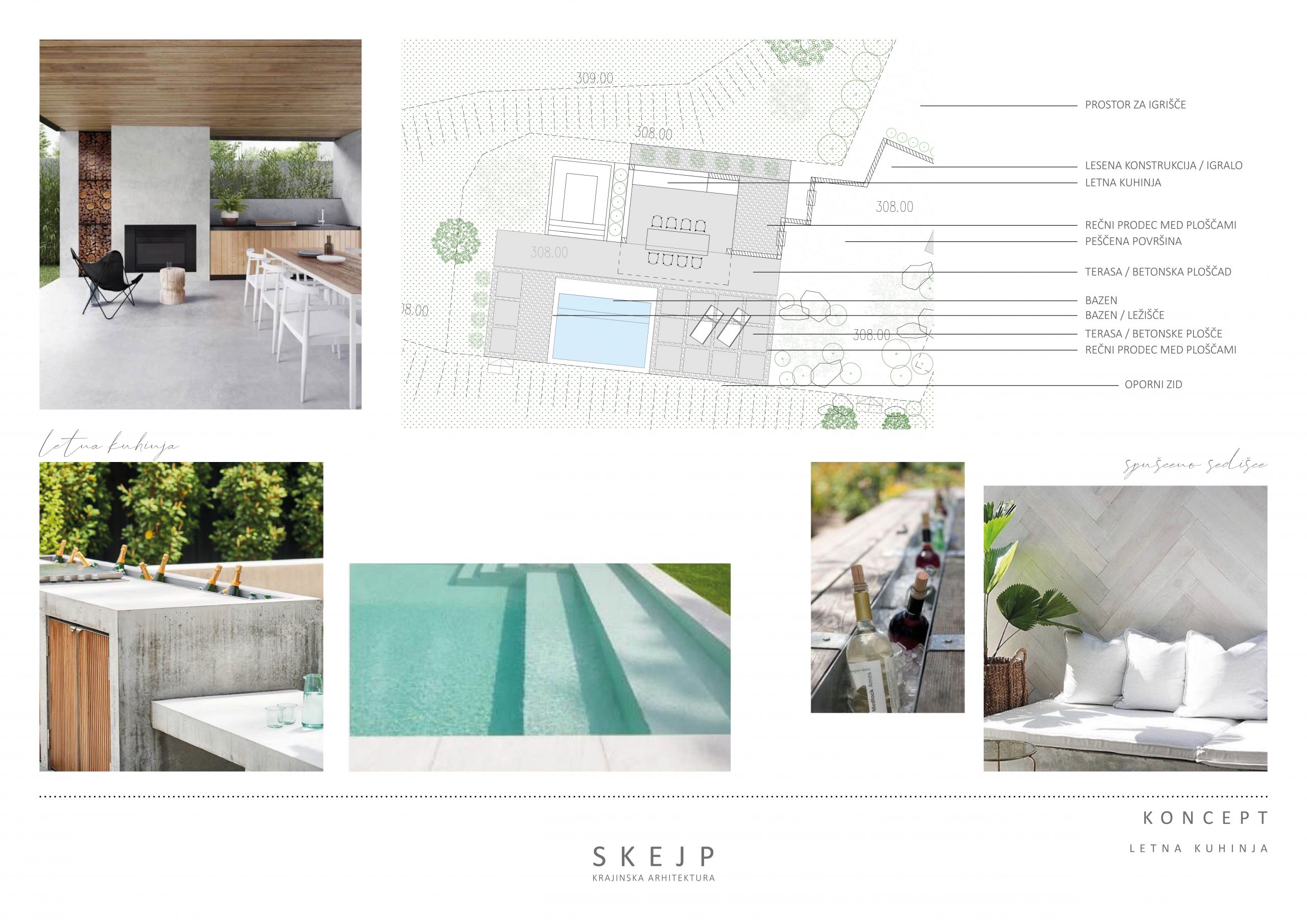 Zunanji bivalni prostor vključuje bazen, tlakovane površine okoli njega, letno kuhinjo pod nadstreškom ter spuščeno sedišče kot sekundarni prostor za druženje. Manjši del tega pa je predvideno tudi kot igrišče.