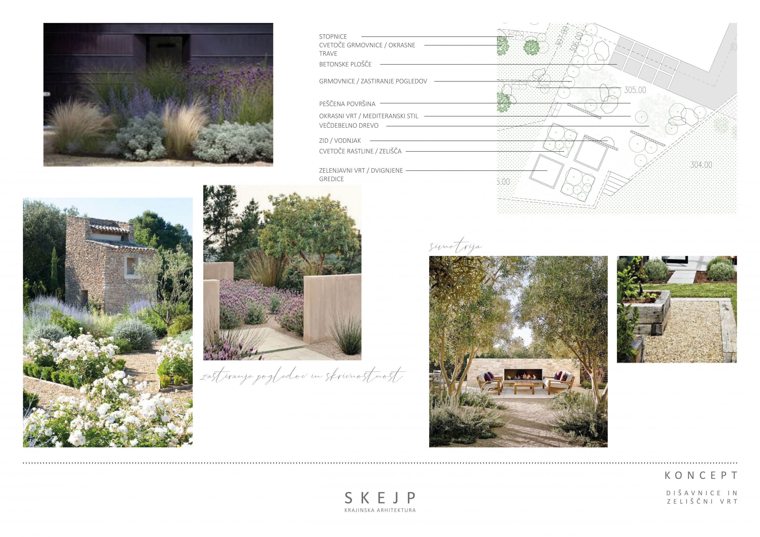 Hiša stoji na severno vzhodnem delu pretežno strme parcele. Iz predvidenih dnevnih prostorov se odpira pogled na celotno dolino, kar smo želeli doseči tudi pri zunanjem prostoru za druženje. Območje je bilo razdeljeno na tri terase oz. višinske nivoje glede na vrsto uporabnosti. Izbor rastlin in materialov je temeljil na želji mediteranskega stila. To smo dosegli z izborom rastlinskega materiala glede na podobne teksture ter barvne tone.