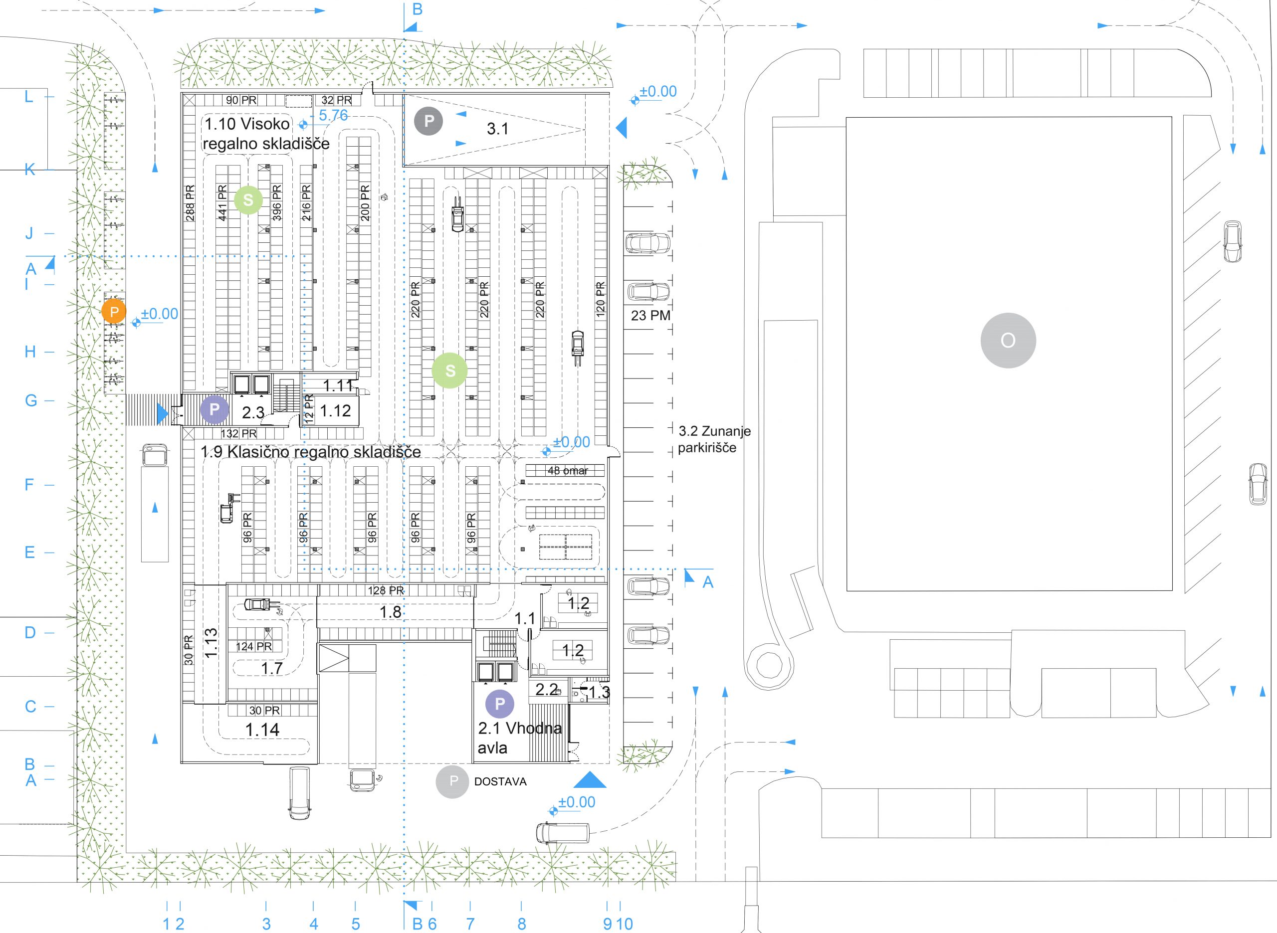 Večina parkirnih mest za motorna in enosledna vozila je v dveh podzemnih etažah, nekaj parkirnih mest ter prostori za kolesa pa so razporejeni tudi po terenu.