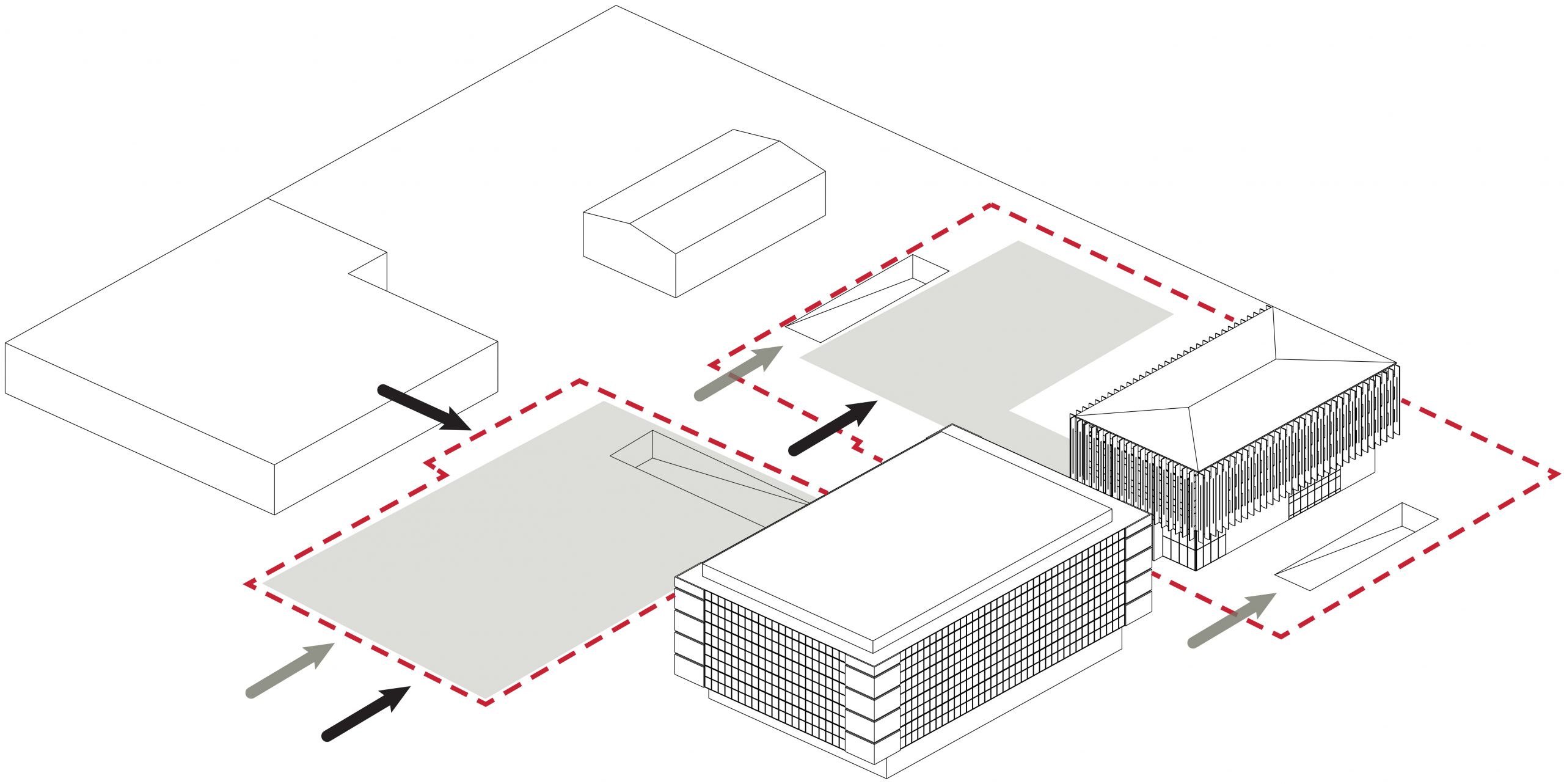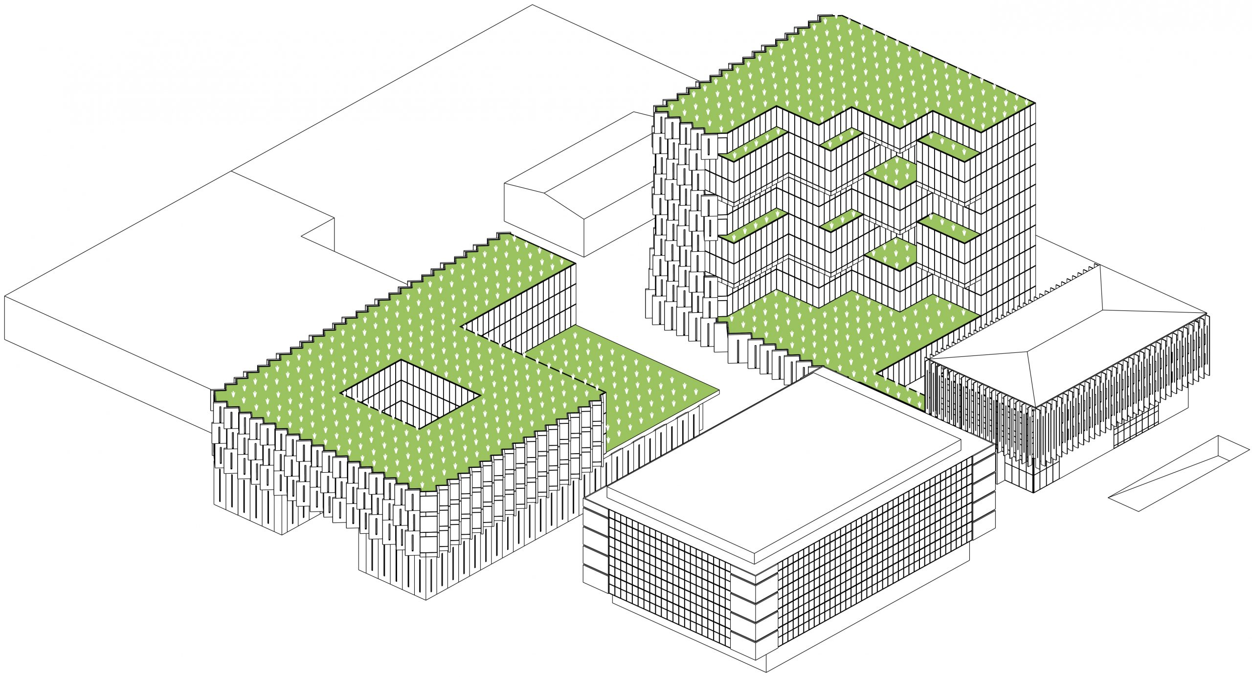 Obravnavano območje se nahaja znotraj industrijske cone katerega parter je v največji meri namenjen parkiranju ter potrebam skladiščnih in proizvodnih procesov. Znotraj območja ni zelenja ; s tem so spodnje etaže objektov degradirane ter ne nudijo prijetnega ambienta za pisarniško delo. Vodilo projekta je vzpostavitev zelene mikroklime ter prepoznavnega poslovnega kompleksa s holističnim prepletom poslovnih in javnih programov.